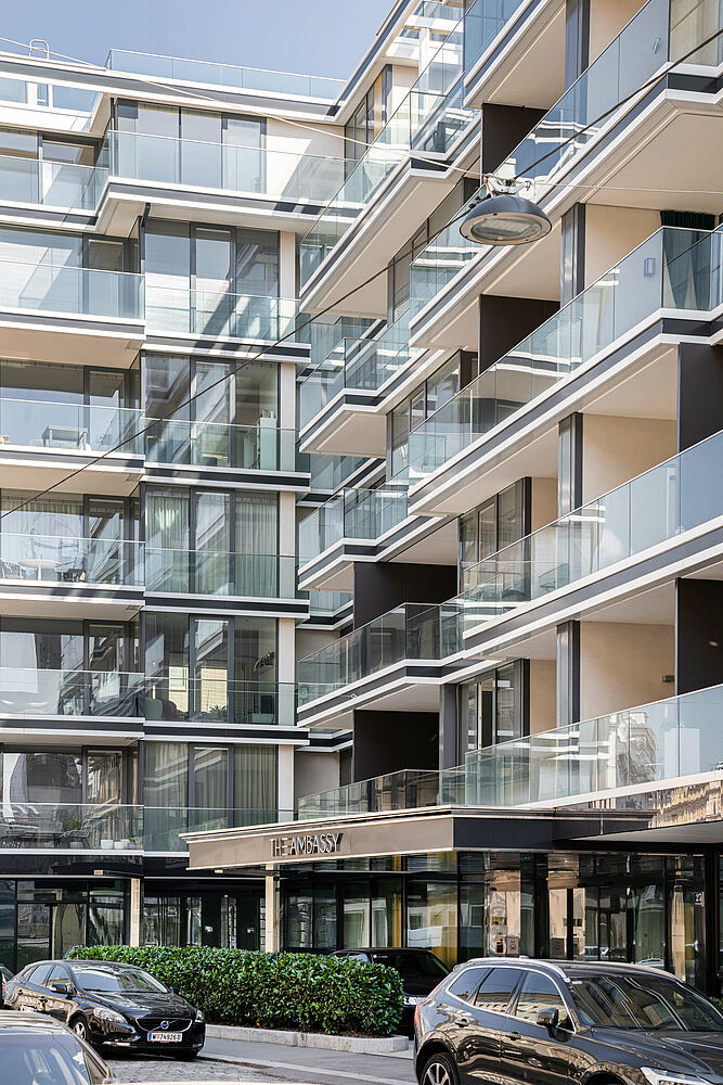 Die Wohnungen sind mit hochwertigen und edlen Materialien ausgestattet und bieten ein stilvolles und mondänes Ambiente. Die außergewöhnliche Architektur mit der offenen Fassade, großflächigen Verglasungen mit raumhohen Fenstern sowie Loggien, Balkonen und Terrassen runden das Bild ab und machen The Ambassy zu einem Landmark-Building Wiens.