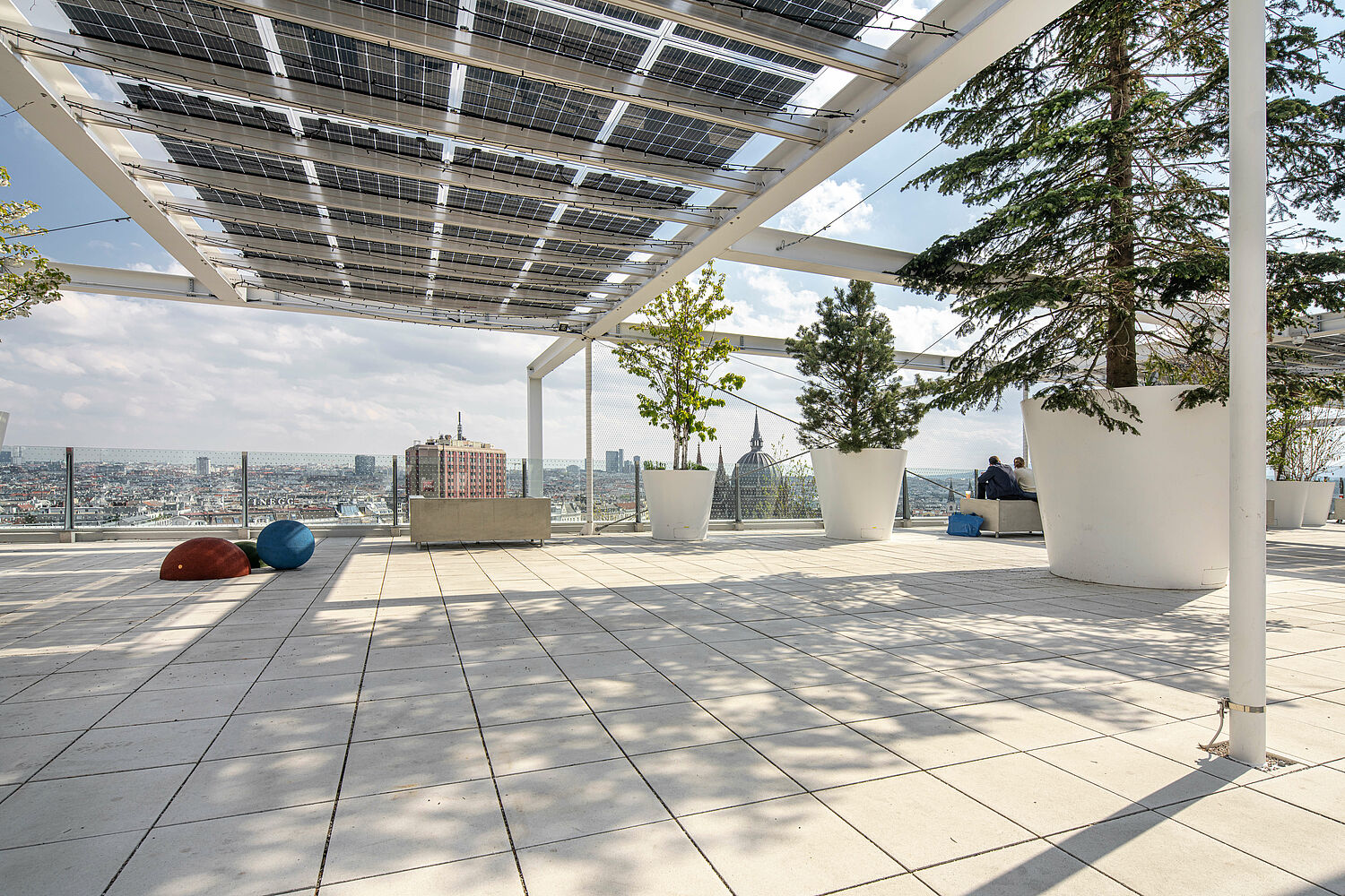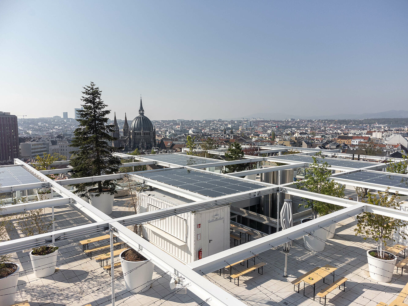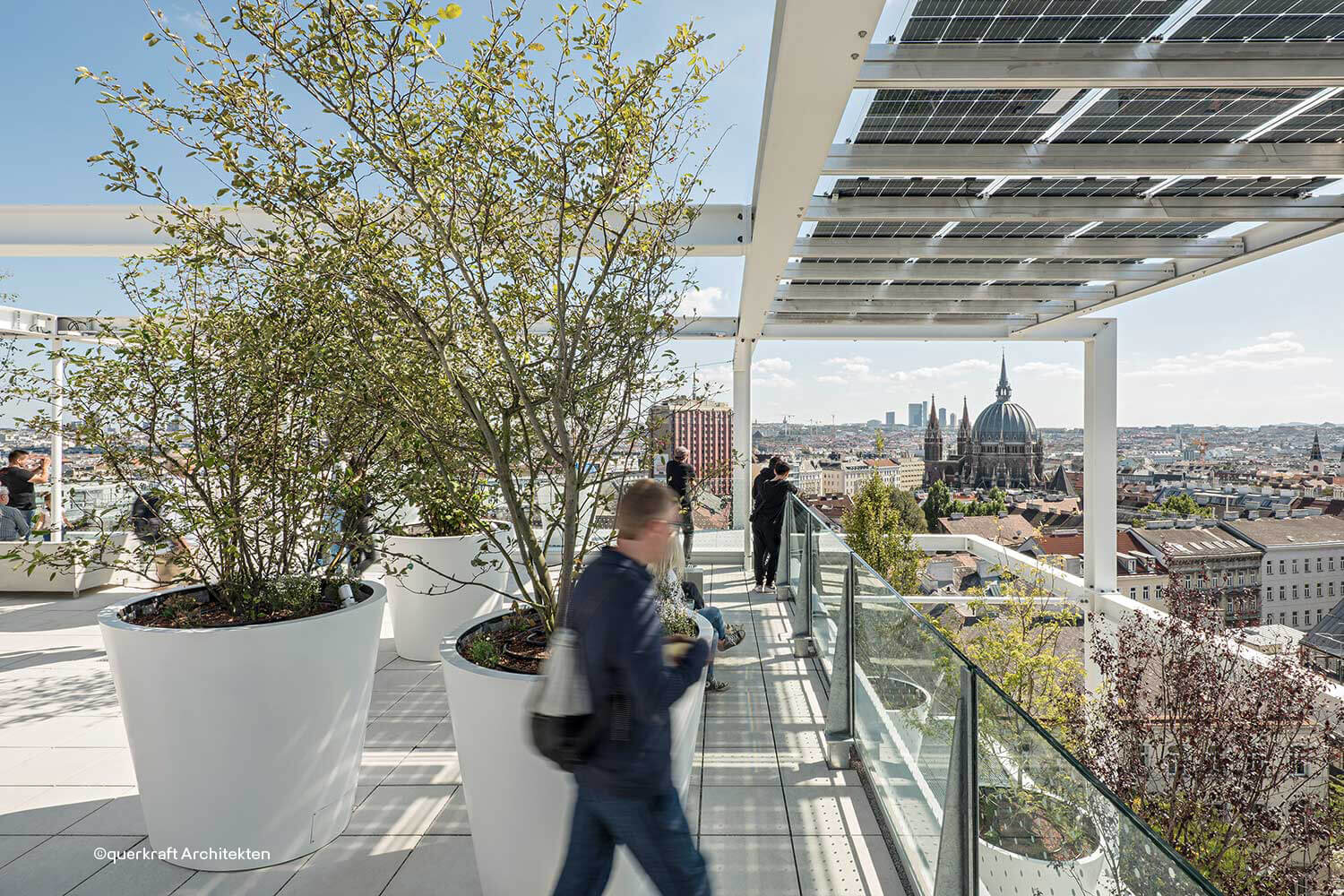Die Architektur und die Nutzungsmöglichkeiten sind immer entscheidende Faktoren für den Erfolg eines Gebäudes, und Querkraft Architekten haben hier ganze Arbeit geleistet. Sie schufen einen ausgesprochen kommunikativen Baukörper mit urbanen Erlebnisräumen und aktiven Dachflächen. Eine grüne Hülle zieht sich um das komplette Gebäude. Sie ist 4,5 Meter tief, spendet viel Schatten und beherbergt Räume, Terrassen, Pflanzen und Aufzüge, Fluchttreppen, Toiletten und die Haustechnik. Fassaden und Dach sind beispielhaft und zukunftsweisend, vor allem im Hinblick auf den Klimaschutz, die intelligente Verdichtung und eben auch die gesteigerten Anforderungen an den Schallschutz.